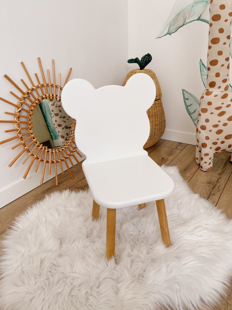 Krzesełko drewniane Biały Misio to stabilne i wygodne siedzisko, które przyciąga uwagę zarówno dzieci, jak i dorosłych. Produkt został wykonany ręcznie w stolarni, tak jak inne krzesełka drewniane Oh Babe.