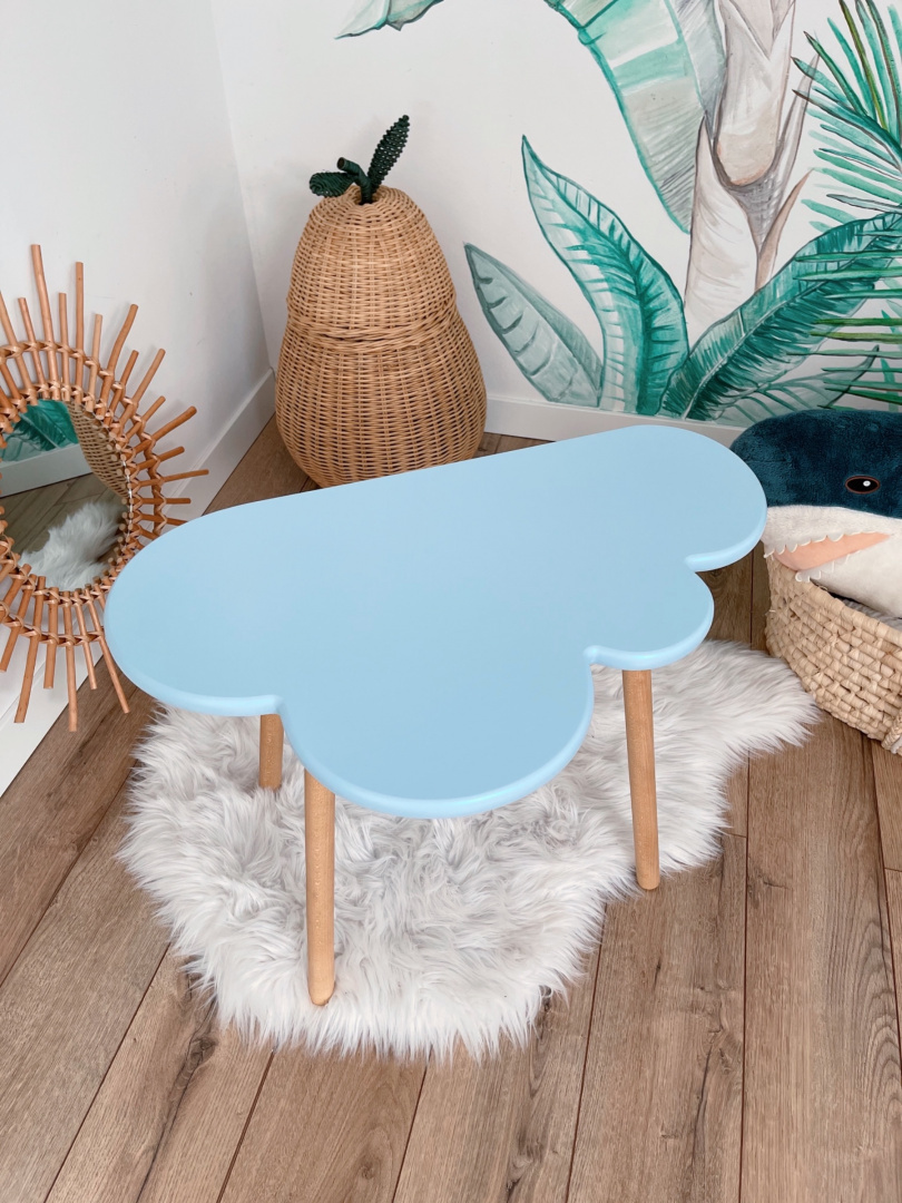 Urokliwy stolik chmurka został wykonany ręcznie w stolarni Oh Babe. Produkt jest stabilny oraz bezpieczny, trwałość zapewniają mu wysokiej jakości materiały użyte do jego produkcji. Stolik chmurka z lakierowanym blatem o wymiarach 64 x 40 cm doskonale prezentuje się w każdym pokoiku dziecięcym.