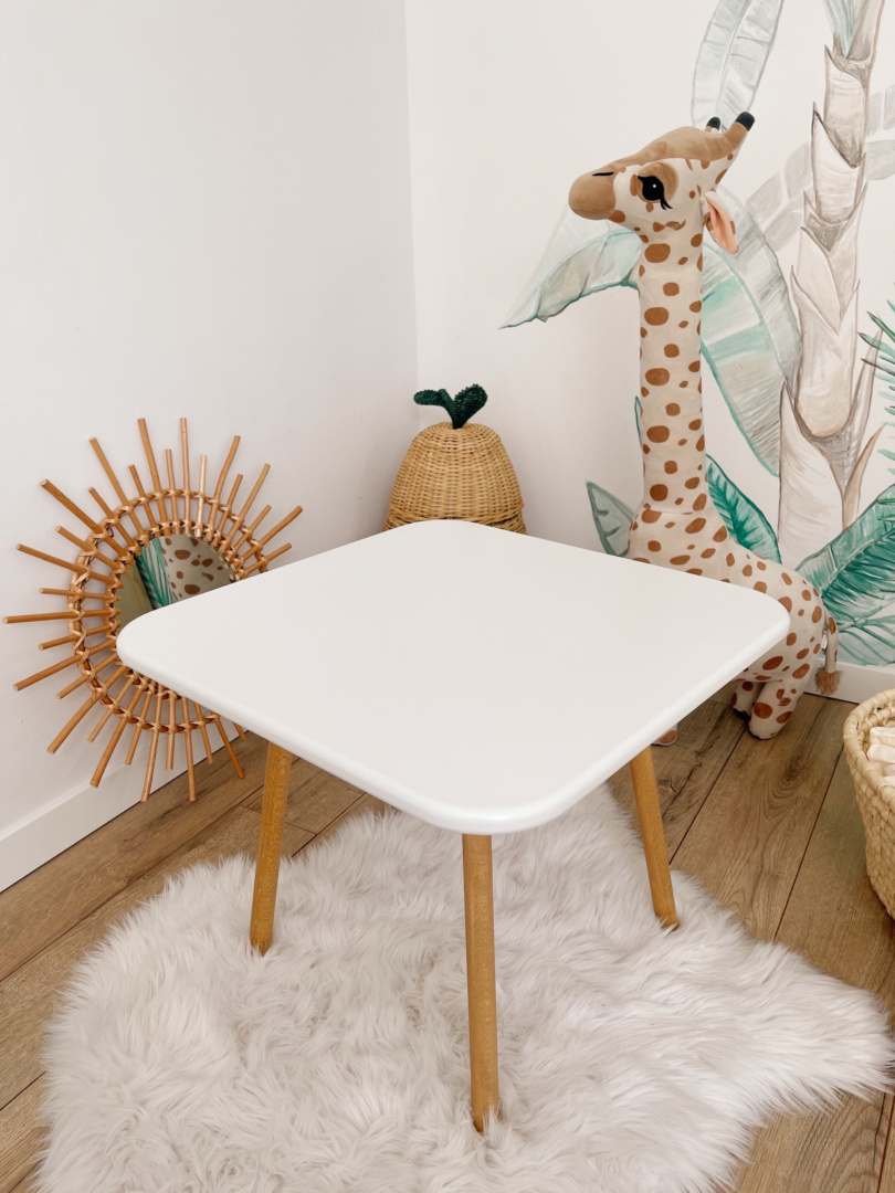 Biały kwadratowy stolik dziecięcy jest bardzo uniwersalny i pasuje do każdego wnętrza. Jeżeli poszukujesz starannie wykonanego mebla z lakierowanym blatem i wykończeniem z drewna bukowego, ten biały stolik dla dzieci będzie odpowiedni.