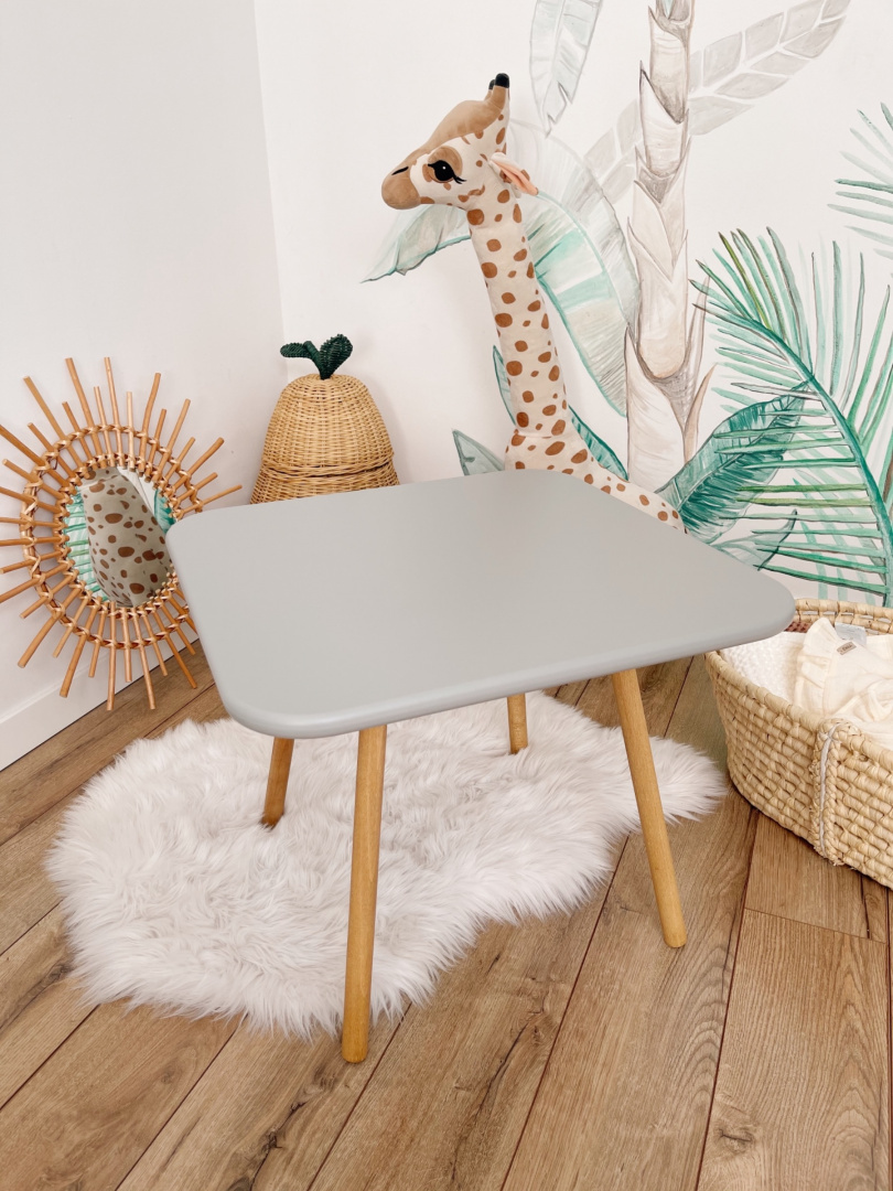 Kwadratowy stolik dziecięcy szary jest bardzo stylowy, dlatego dobrze prezentuje się w każdym pokoju dziecięcym. Ręczne wykonanie oraz wysokiej jakości materiały sprawiają, że ten szary stolik dla dzieci jest stabilny i bezpieczny.