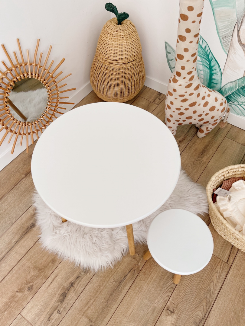 Okrągły stolik dla dzieci ręcznie wykonany, z lakierowanym blatem i nóżkami z drewna bukowego. Urokliwy i uniwersalny, odpowiedni zarówno do pokoju dziewczęcego, jak i chłopięcego. Ten biały okrągły stolik świetnie prezentuje się w każdym wnętrzu.
