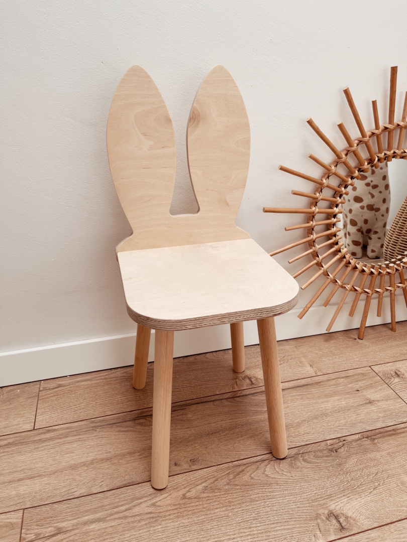 Krzesełko dziecięce króliczek to piękny mebel wykonany z brzozy fińskiej. Oryginalne oparcie w kształcie zajęczych uszu urzeka zarówno najmłodszych, jak i ich rodziców. Krzesełko drewniane króliczek od Oh Babe jest nie tylko stylowe, ale i stabilne.
